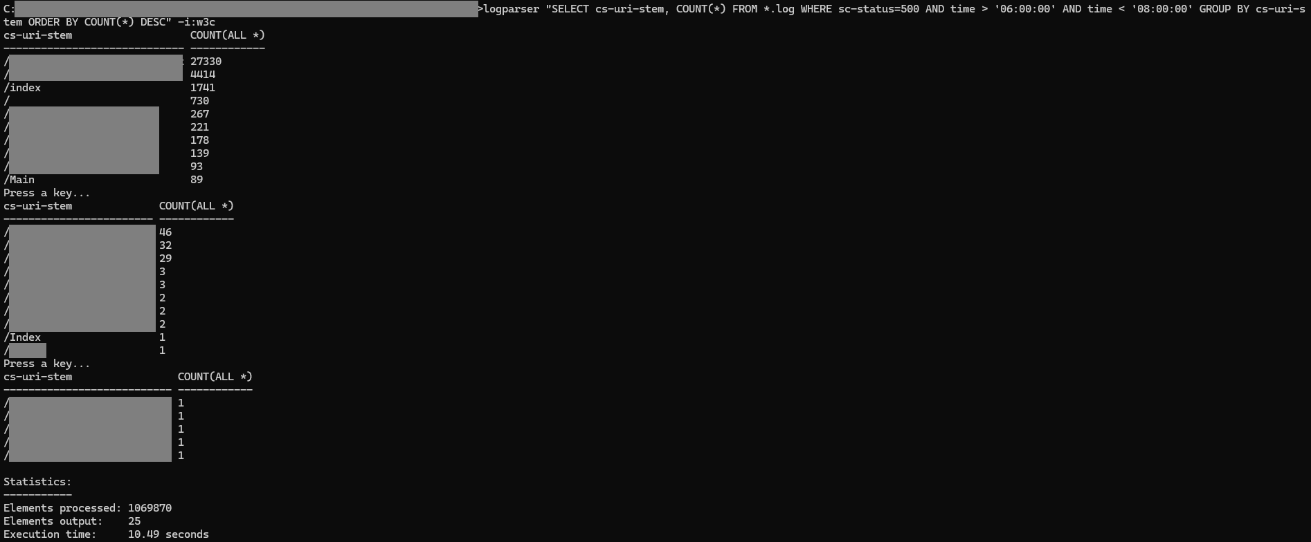 logparser “SELECT cs-uri-stem, COUNT() FROM .log WHERE sc-status=500 AND time > ’06:00:00′ AND time < ’08:00:00′ GROUP BY cs-uri-stem ORDER BY COUNT(*) DESC” -i:w3c