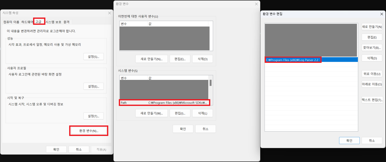 시스템 설정 > 고급 탭 > 환경 변수 > 시스템 변수, Path 편집 > Log Parser 2.2 경로 추가