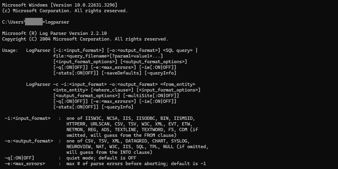 cmd창에서 logparser 입력 시 관련 도움말이 뜨면 환경변수 설정 완료.