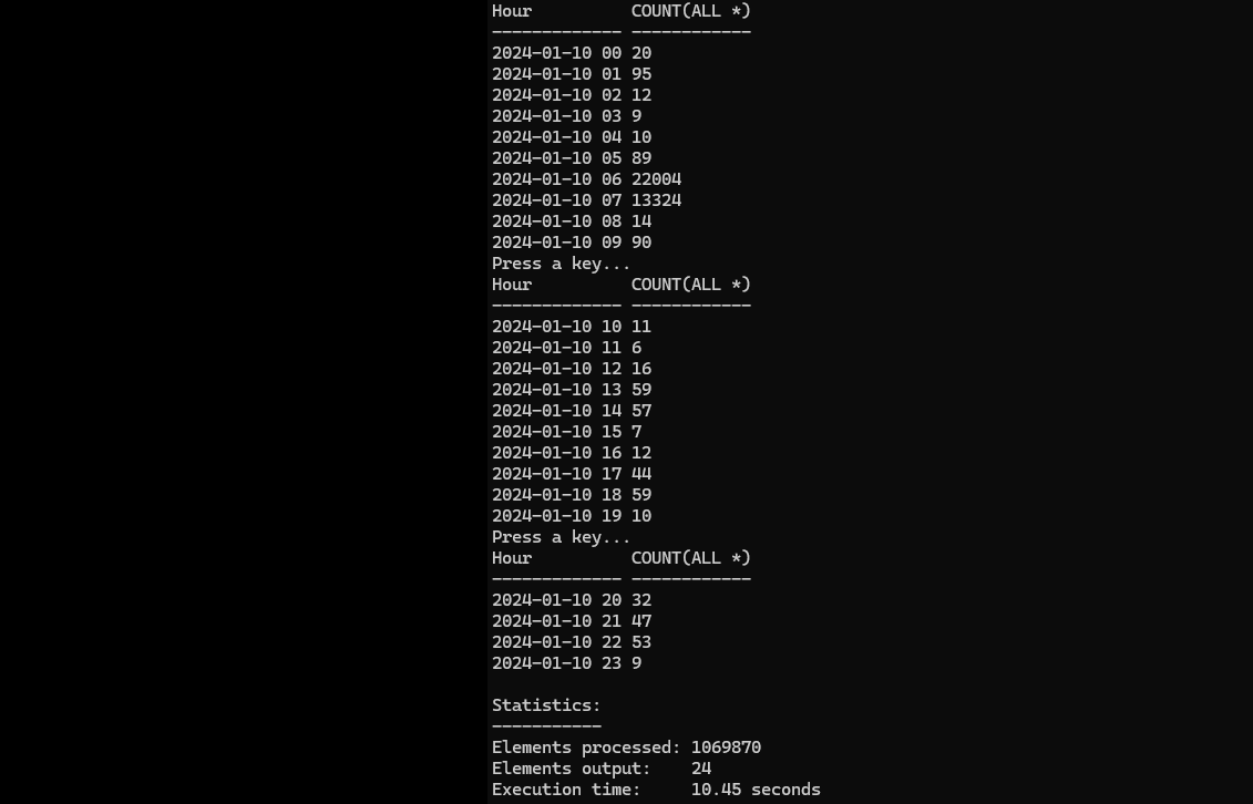 logparser “SELECT TO_STRING(TO_TIMESTAMP(date,time),’yyyy-MM-dd hh’) AS Hour, COUNT() FROM .log WHERE sc-status=500 GROUP BY Hour ORDER BY Hour” -i:w3c